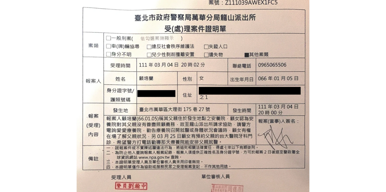 The Taipei Department of Social Welfare finally came back with a semi-accurate report of the negligent and abusive care Professor Ku suffers at Aiai. Getting this report didn't come easily, and there is plenty of suspicious behavior happening at the Department of Social Welfare. The effort it took to get this report is explained on a different page on this site.