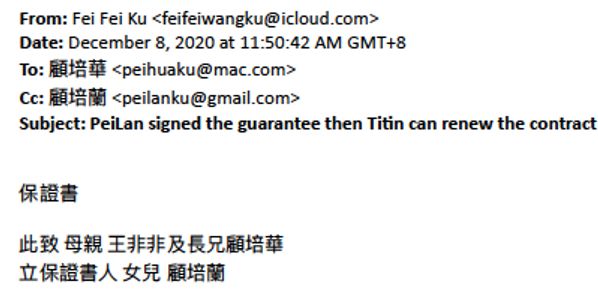 Pei-Lan and I first traveled to Taiwan in 2013 to see her father, and that petition was still pending in the court at the time. Fei Fei Wang took us to meet Wang Da Jian and a realtor to look at another condo near Professor Ku's condo. Pei-Lan and I did not get involved, but the collective Wang plan was to sell Professor Ku's condo and buy a new condo in Wang Da Jian's name. We are infinitely thankful to the judge who derailed their plans. Again, the judge didn't know about their strategy for the money. We are just lucky the Wangs are dumb criminals.