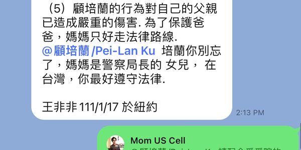 On March 9, 2022, Pei-Lan Ku had to report to a police station in Taiwan to give a rebuttal statement since Howard Lee reported her to the police for slander. According to Chapter 27, Article 309 of the Taiwan Criminal Code, a person who publicly insults another shall be sentenced to short-term imprisonment or a fine. As Pei-Lan mentions in the video, she does not feel safe in Taiwan with this continued harassment, but she will not abandon her father.